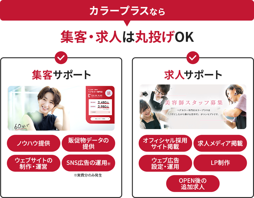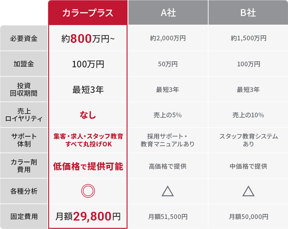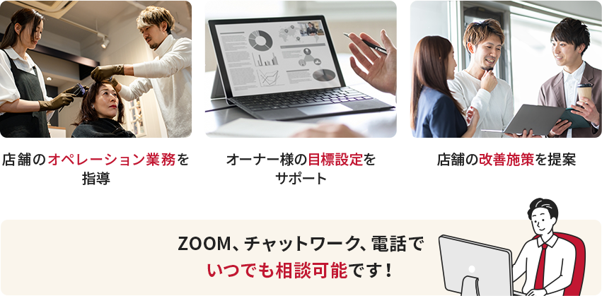 - 集客、求人、スタッフ教育すべて仕組み化されており、しかも本部の方が全部対応してくれました。そのおかげで自店の運用に集中でき時間も有効活用できています。